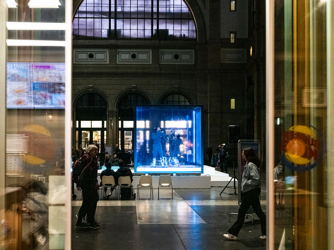 Die Gewinner*innen aus Kapitel I (Theaterspektakel 2019) sind gefangen im erbarmungslosen Takt eines Laufbands, ausgestellt in einem Kubus in der Wannerhalle des Zürcher HB.